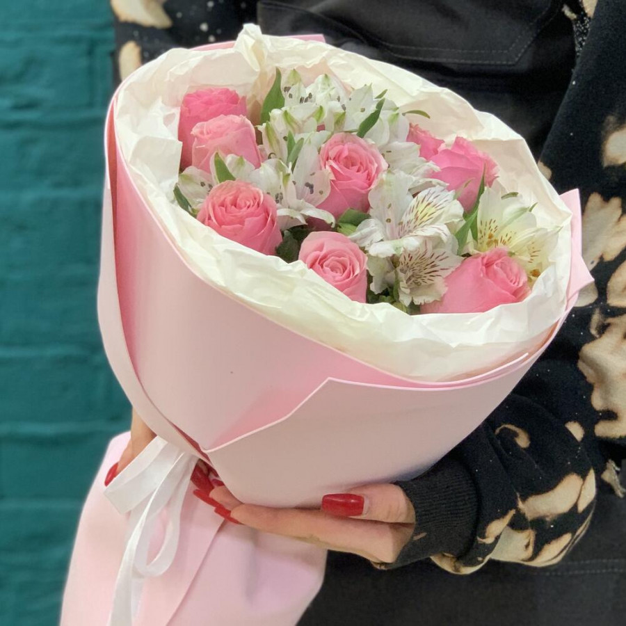 На фото букет «очарование чувств». В составе: роза 9 шт, альстромерия 3 шт, фоамиран 2 шт, атласная лента 1 шт, . Все цветы свежие и ароматные, букет красиво оформлен и отлично подходит для подарка. Доступна доставка цветов или самовывоз.